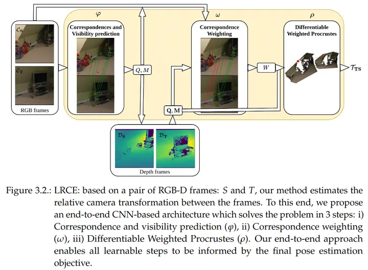 LRCE introduces an end-to-end differentiable model for pose estimation between pairs of RGB-D frames (color + depth). The key idea is learning confidence scores for correspondences (matched points between images) in a self-supervised manner, helping to filter outliers and improve pose accuracy.